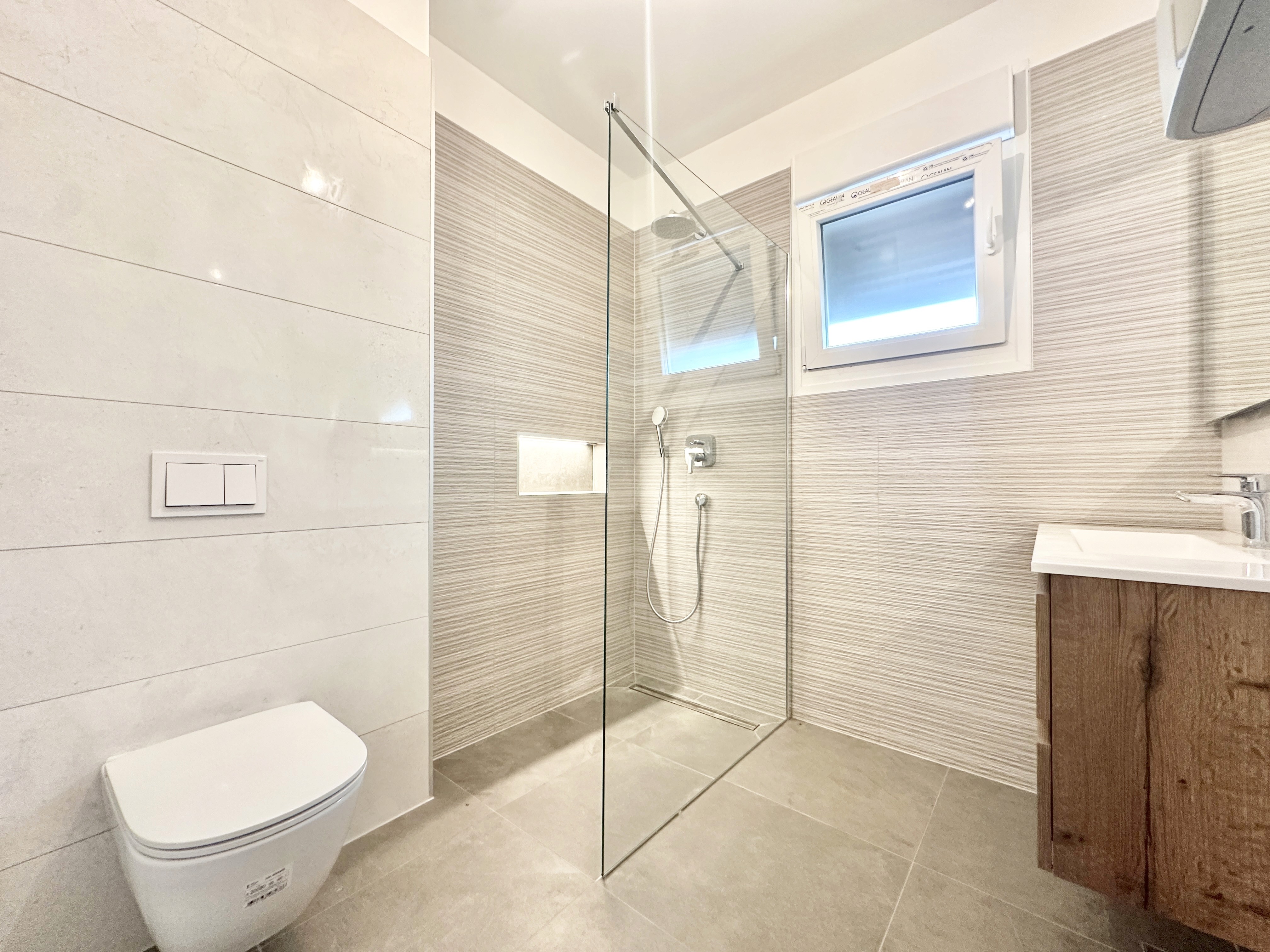 The apartment is fully finished and ready to move in, built with quality materials and modern installations designed for comfort and energy efficiency. Features include security entrance doors, triple-glazed windows, electric shutters, and underfloor heating in the bathroom.